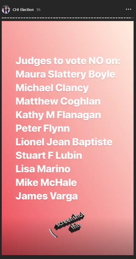 And if you are a forward-thinking person who lives in Chicagoland, and you plan to go vote in person on Tuesday, save a screen shot of the image below. It’s Prerna’s list of judges to nix, from her ridiculously informative Instagram story. She is a treasure and we’re lucky to have her.
